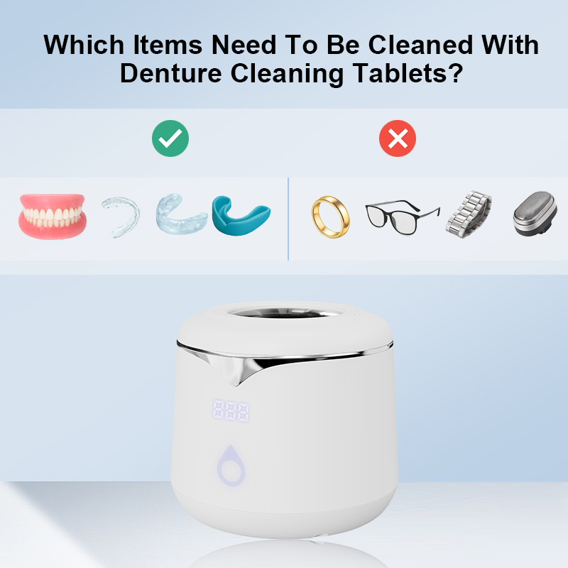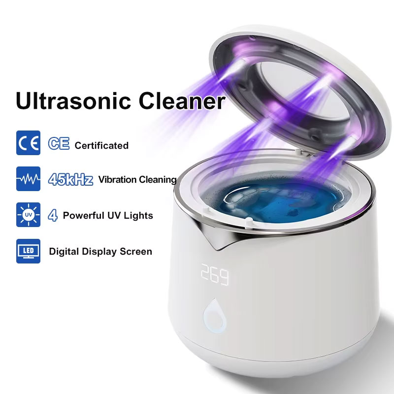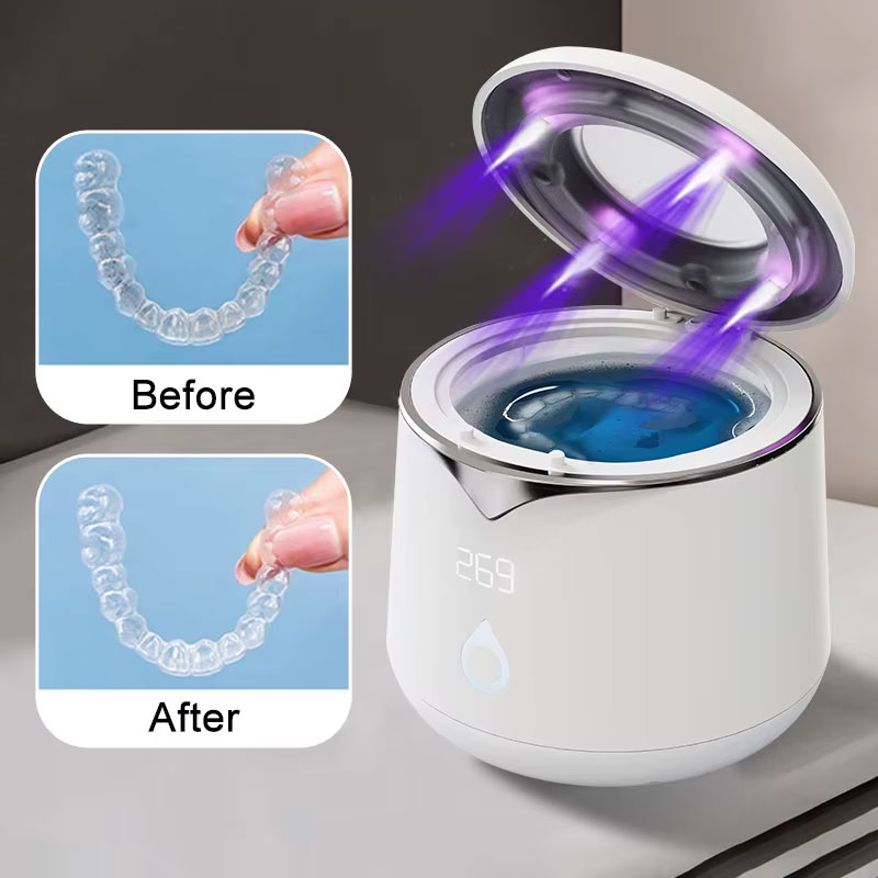 Compact 45kHz dental ultrasonic cleaner, ideal for effectively cleaning aligners, retainers, and other dental appliances at home or on the go.